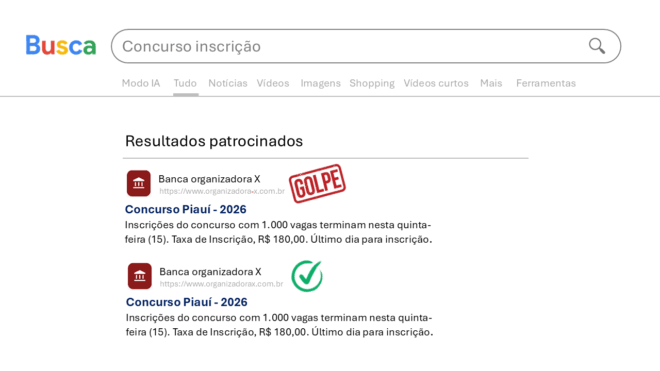 Esses sites fraudulentos costumam aparecer em anúncios patrocinados em buscadores e redes sociais, simulando páginas de concursos públicos, lojas virtuais, planos de saúde e até órgãos governamentais. Ao acessar o conteúdo e realizar pagamentos, a vítima acaba transferindo dinheiro diretamente para contas controladas pelos criminosos.