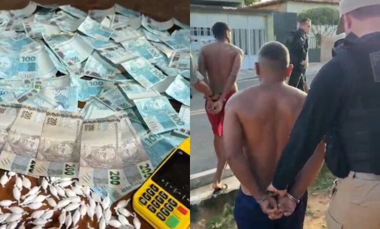 “Um volume de dinheiro, a grande maioria notas de R$ 100 e R$ 200, foi apreendido aqui em um dos principais endereços de um investigado que tem relação com o tráfico de entorpecentes e também com facção criminosa aqui na região”, destacou o delegado Charles Pessoa, do Departamento de Repressão às Ações Criminosas Organizadas (DRACO).